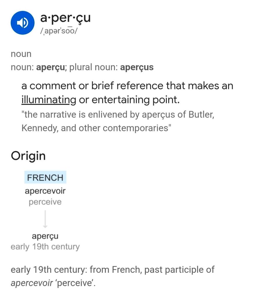 WOTD: aperçu Share this: Share on X (Opens in new window) X Share on Facebook (Opens in new window) Facebook Email a link to a friend (Opens in new window) Email Like Loading... Related Published by thegreatknock I'm weary and wary of compacting life into a plain, white text box. Fit a human life on an index card? I think not. View all posts by thegreatknock